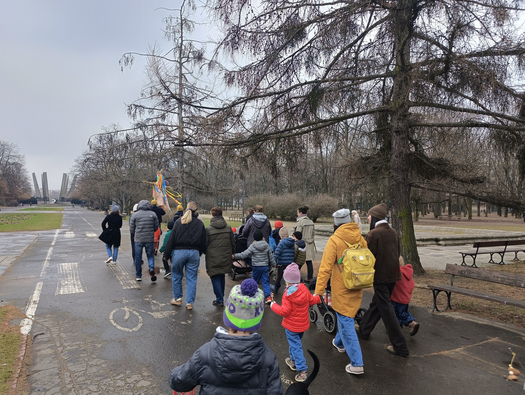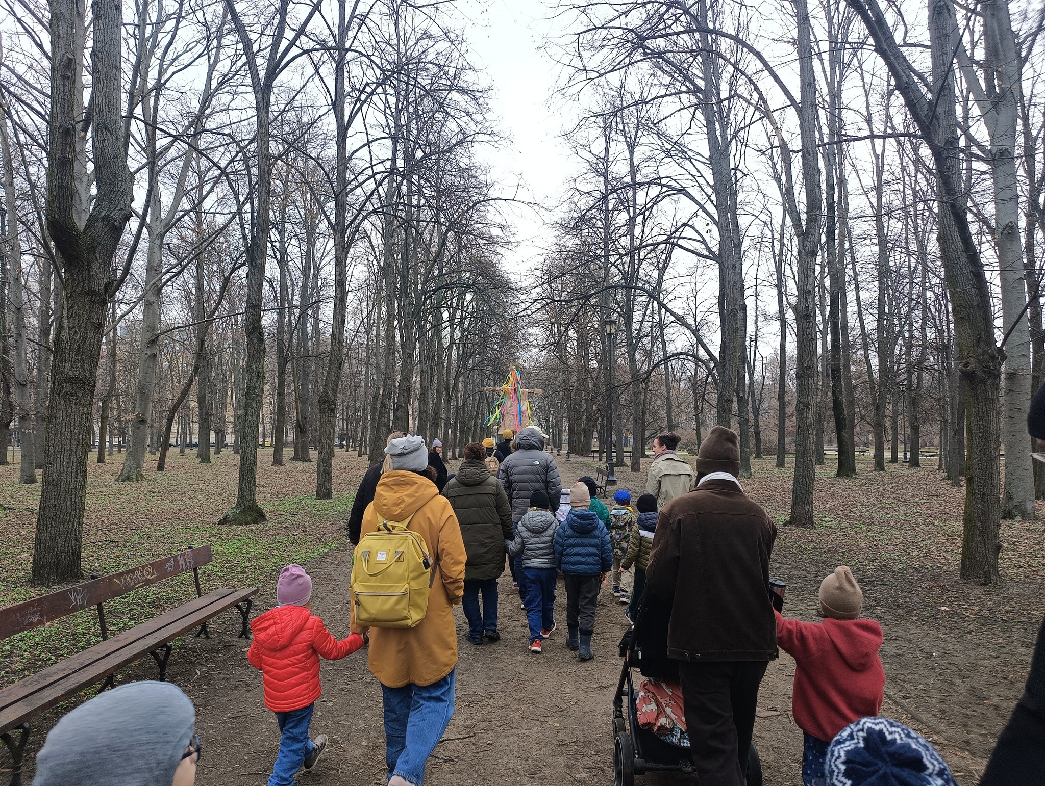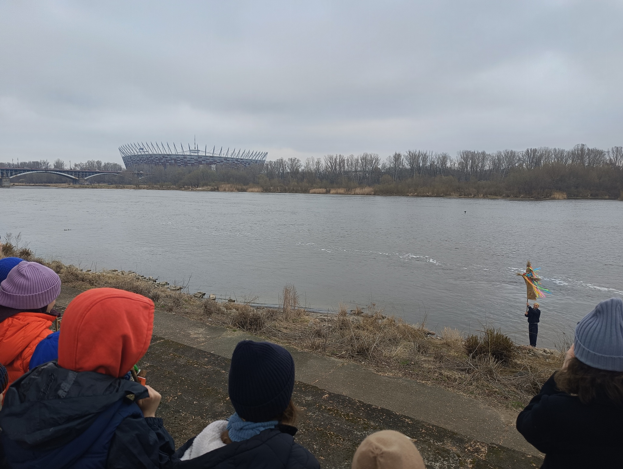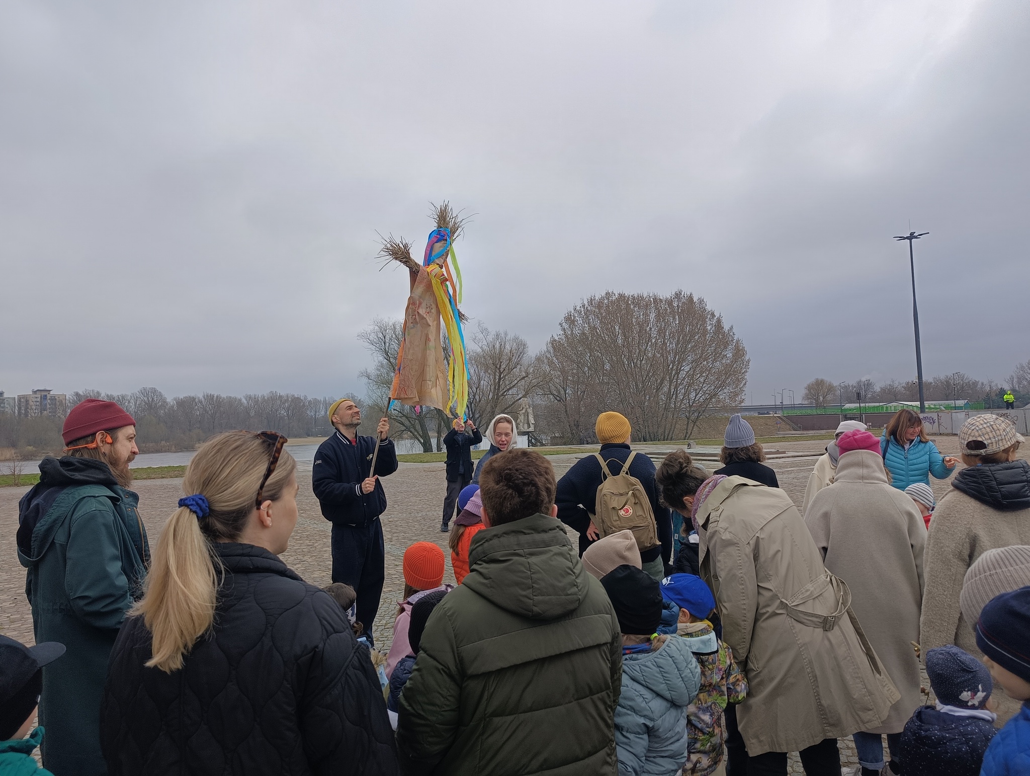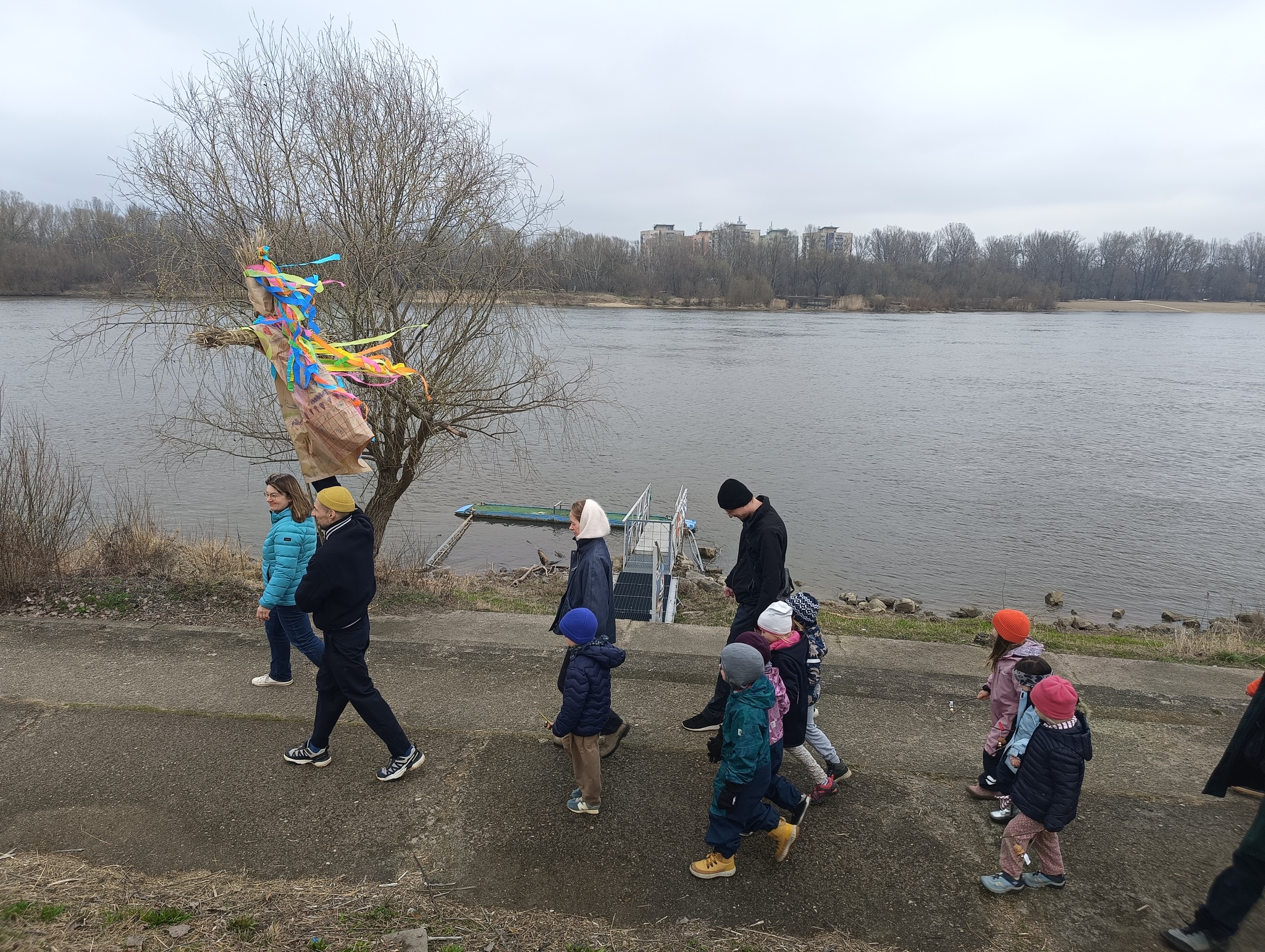 Nasze wiosenne świętowanie rozpoczęliśmy od tradycyjnego spaceru nad brzeg Wisły. W barwnym korowodzie, ramię w ramię, szli rodzice, dzieci oraz nauczycielki. Centralną postacią była oczywiście Marzanna – symbol odchodzącej zimy, chłodu i zastoju.