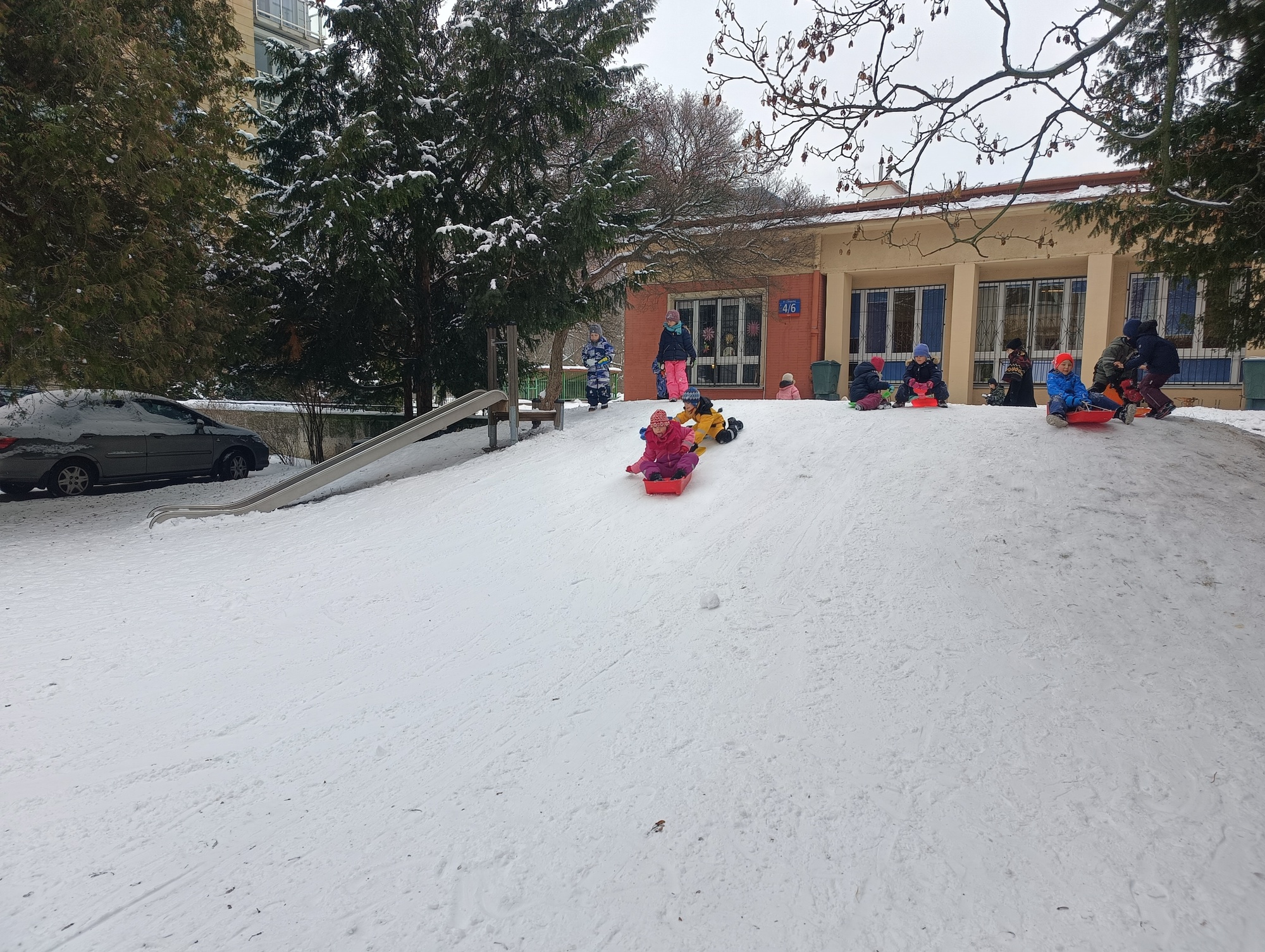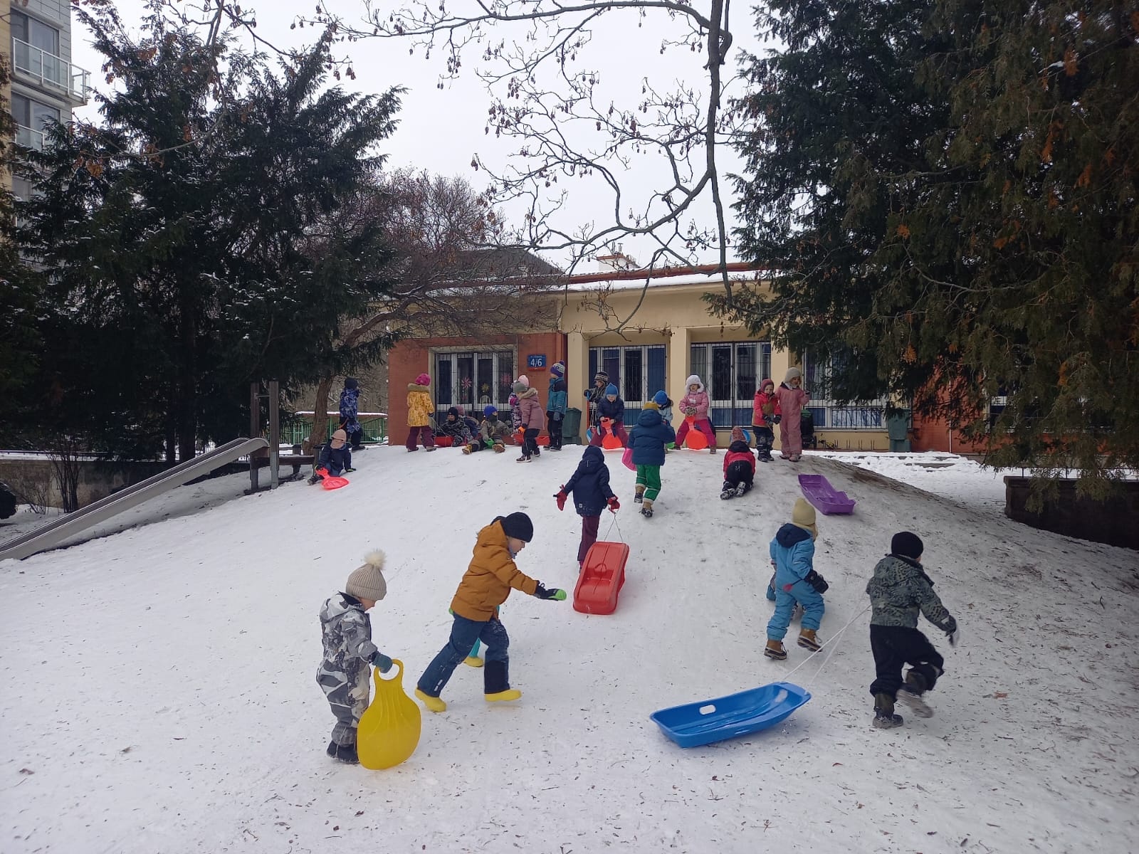 Zima w naszym ogrodzie to czas prawdziwej radości z ruchu na powietrzu. Lepimy bałwany, budujemy śnieżne domki, organizujemy zimowe zabawy i – gdy tylko warunki pozwalają – ruszamy na sanki. Mróz szczypie w policzki, nogi pracują, śmiech niesie się daleko, a dzieci wracają do sali rozgrzane, spokojniejsze i dumne ze swojej „zimowej sprawczości”.